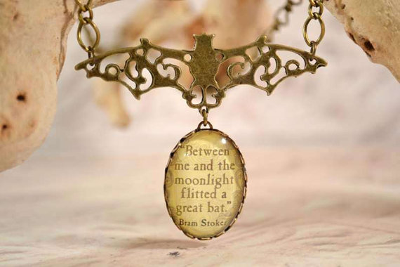 This tasteful Bronze Bat is accompanied by a Glass Pendant that contains a quote from Bram Stoker’s Dracula. If your want to show your Halloween spirit or you have a weakness for vamps, this pendant is ideal for you. Note, this pendant is not black or silver. The material used to mae the pendant sets it apart from todays generic bat or vampire jewelry. At a glance, it looks like a normal necklace. When you take a closer look, you see the bat and the quote. Overall, it’s unique and clever.