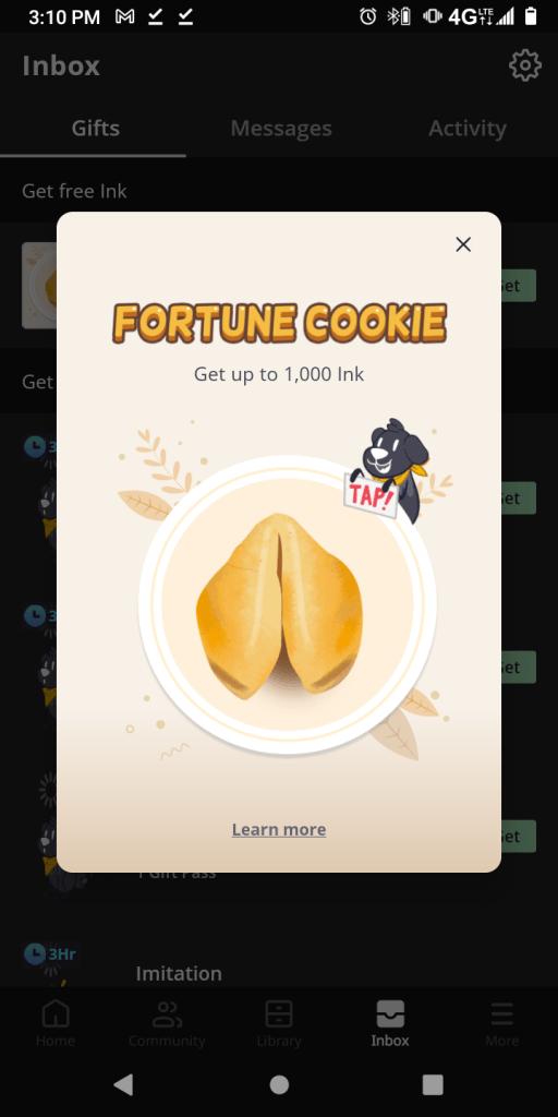 Currently, there are four ways to earn ink. They are as follows: reading events, ads, treasure hunts and fortune cookies. Tapas has daily reading events that help readers earn ink. The reading amount and quantity varies. The events are themed and cover a variety of tropes. Even if that webcomic isn’t your cup of tea, you can earn ink for other series.