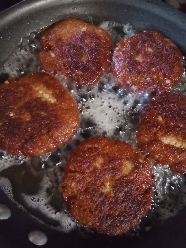 - Use 1/3 Cup to scoop and shape patties. Then add patties to medium high vegetable oil (about half of the pattie should be submerged in oil)