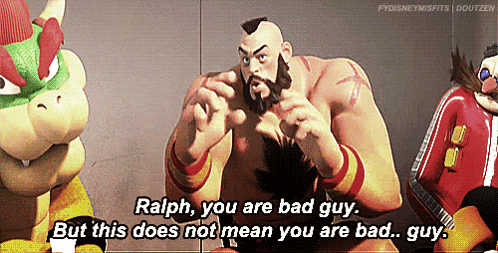 Fix It Felix is basically a “nice guy” he’s praised by his tenants on a daily basis. He is friends with other classic heroes like Mario, Sonic, and Pacman. Yet, he doesn’t think to invite Ralph to their 30th Anniversary party. In fact, he attempts to get rid of Ralph. Since he has to maintain his “nice guy” image, he reluctantly invites Ralph in. Honestly, it seems like he really tries to minimize his interactions with Ralph outside of business hours.