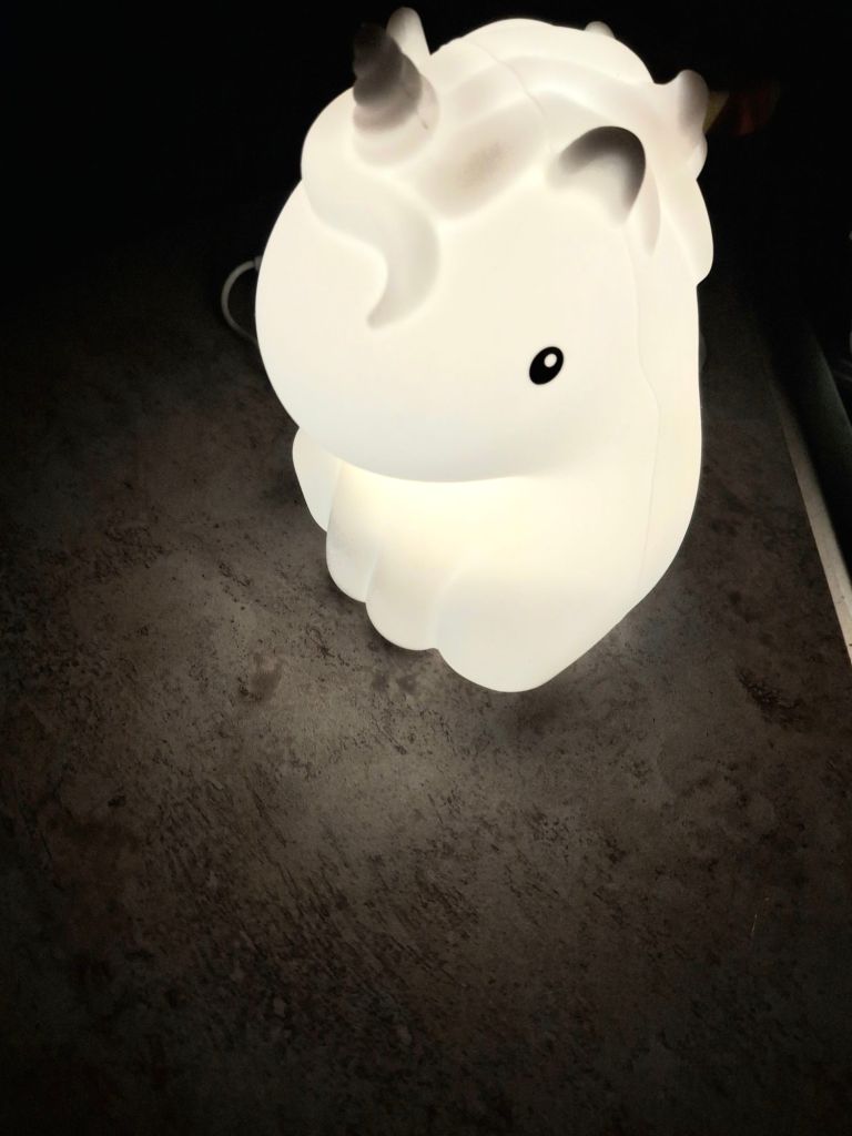 Of all the designs I’ve tried so far, my favorite are the bear, dog, and unicorn. That is because they have a wider base. These three are in a seated position, which makes it easier to secure the cord for continues charge. The Brontosaurus and llama are standing. There is less silicon surrounding the base of the light. This makes them sensitive to movement. So they change color more unintentionally than the other tap lights.